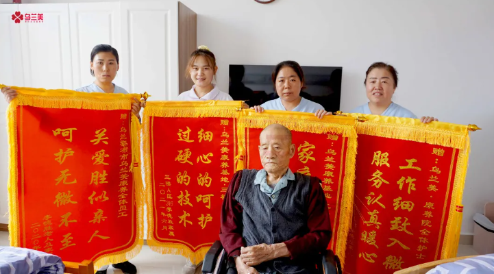 原來,李爺爺家屬口中的護(hù)士和護(hù)理人員們都在烏蘭美康養(yǎng)院工作,她們用過硬的專業(yè)知識(shí)和嫻熟的照護(hù)技能,對入院的長者進(jìn)行專業(yè)護(hù)理,用細(xì)心、耐心、愛心、責(zé)任心陪伴左右,不怕苦、不怕累,盡職盡責(zé)的為長者緩解消除恐懼、焦慮和陌生感,減輕身心痛苦。她們待長者如親人的用心照料,讓李爺爺家屬十分感動(dòng),所以連送四面錦旗,以表誠摯的感謝。